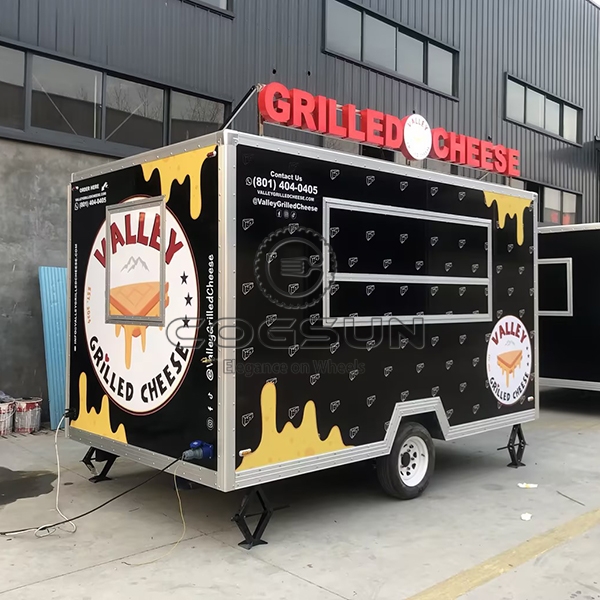 The 10ft black sticker square food trailer for grilled cheese is a stylish, efficient mobile kitchen unit, featuring a 10ft long striking black exterior with vibrant yellow cheese-drip graphics and prominent branding; its square design optimizes space for food prep and service while ensuring compactness and easy towability to diverse locations, making it ideal for food entrepreneurs.
