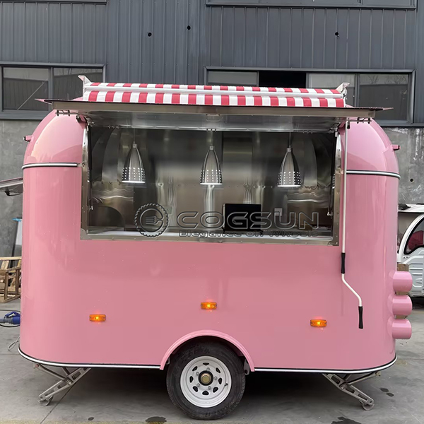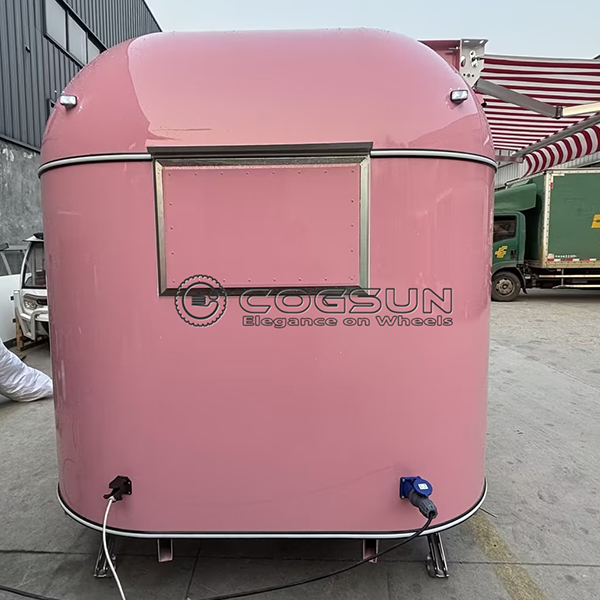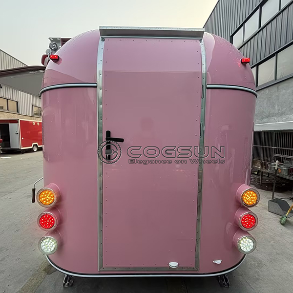 The 10ft pink airstream food trailer’s bright pink exterior makes it stand out among other food trucks, adding a touch of playful femininity and attracting attention wherever it goes. A red and white striped awning extends from the roof, providing shade for waiting customers and creating a warm and comfortable atmosphere. Large service windows on the sides facilitate efficient interaction between staff inside and customers outside, enabling quick order taking and food delivery.