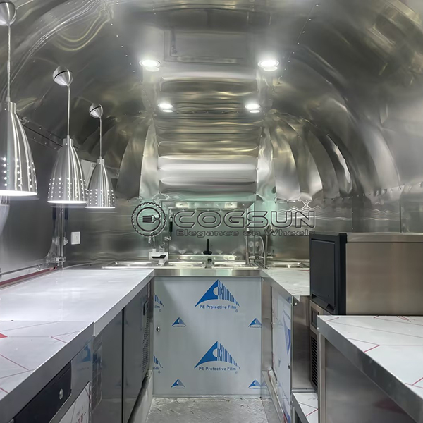 A powerful ventilation system is installed to remove smoke, steam, and cooking odors from the cooking area. This maintains a comfortable and safe working environment for the staff and prevents the buildup of unpleasant smells inside the trailer.