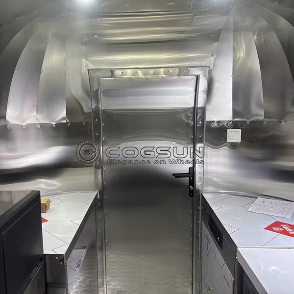 There are multiple storage cabinets inside the trailer, offering sufficient space to store ingredients, utensils, and small appliances. This helps keep the workspace organized and ensures that everything you need is within easy reach, saving time during food preparation.