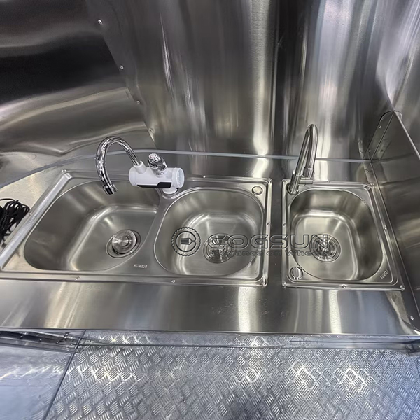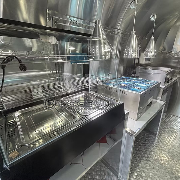 A powerful ventilation system is installed to remove smoke, steam, and cooking odors from the cooking area. This helps maintain a comfortable and safe working environment for the staff and prevents the buildup of unpleasant smells inside the trailer.