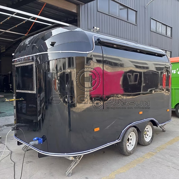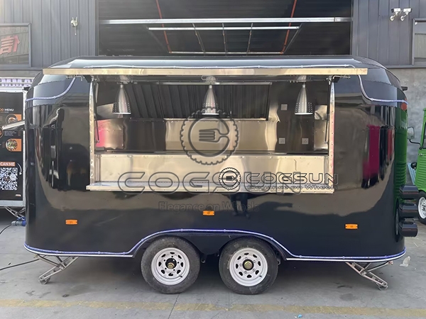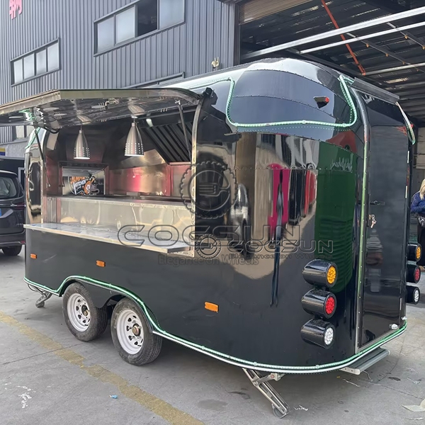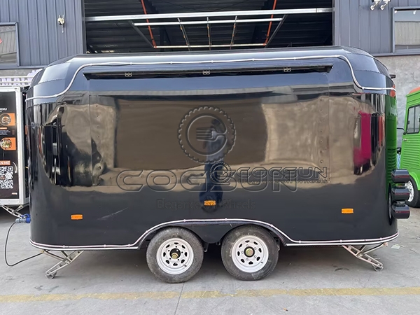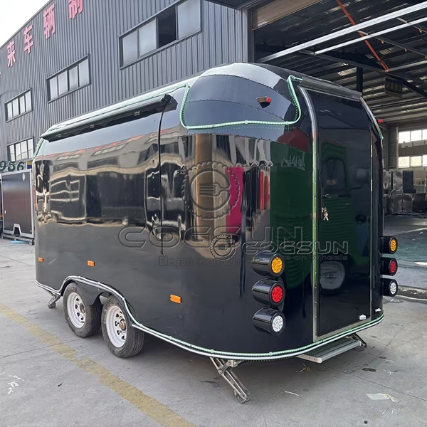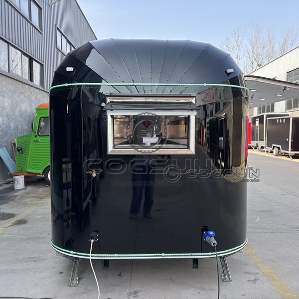 The 13ft black airstream food trailer is an appealing option for food entrepreneurs, seamlessly merging classic Airstream design—characterized by its iconic, streamlined silhouette—with a sleek black finish that adds a touch of modern sophistication; its compact 13-foot size allows for easy towing and parking across diverse locations while still providing ample interior space for efficient food preparation and service, making it a practical and stylish choice in the competitive food service sector.