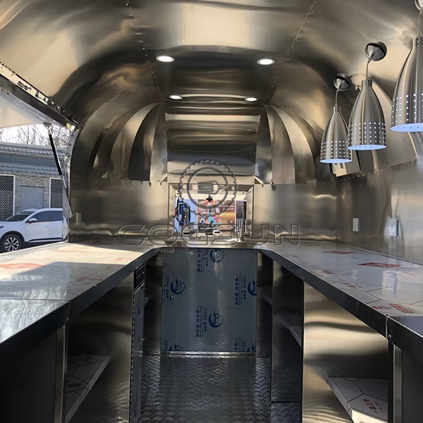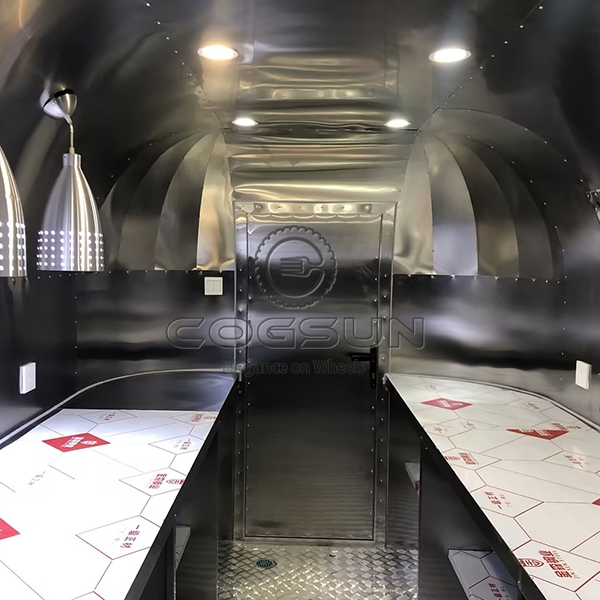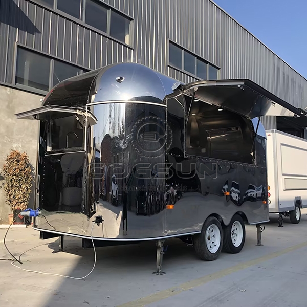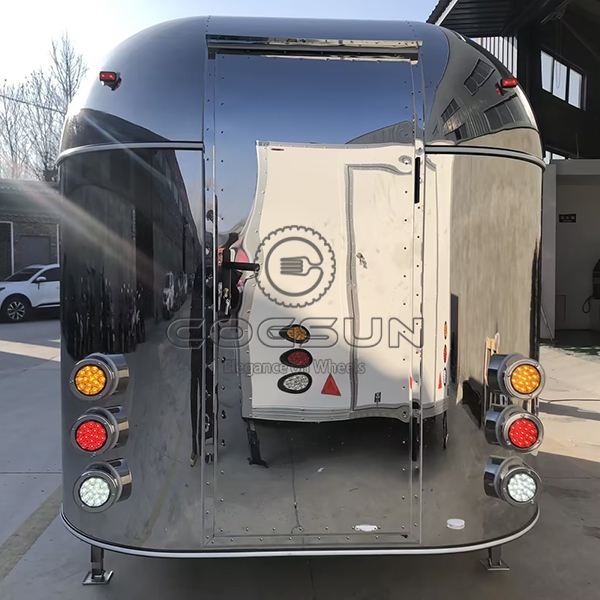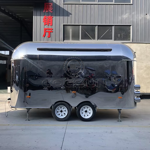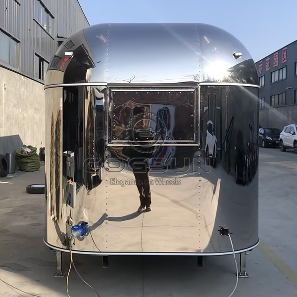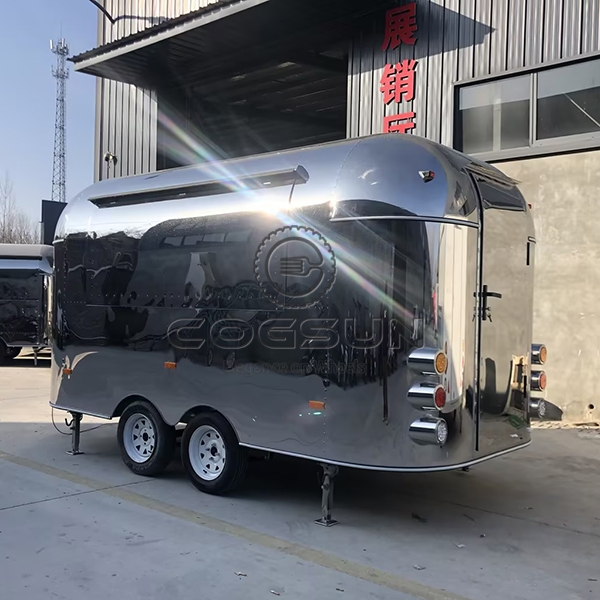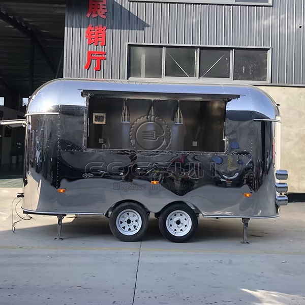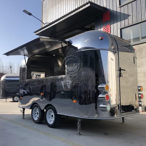 The 13ft mirror airstream food trailer is a modern, visually appealing mobile food cart. Its mirrored exterior gives it a unique sense of style and elegance, making it a focal point in any setting. The compact design facilitates transport and handling, while the spacious interior allows for efficient execution of various food service tasks.