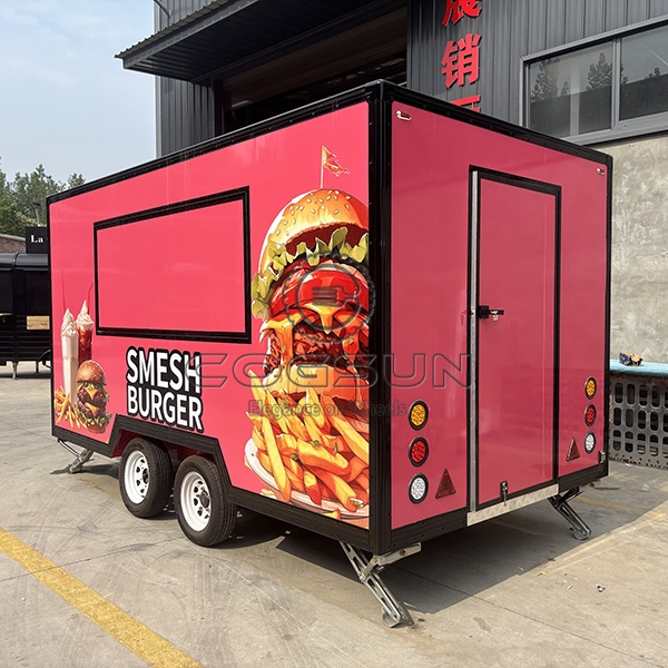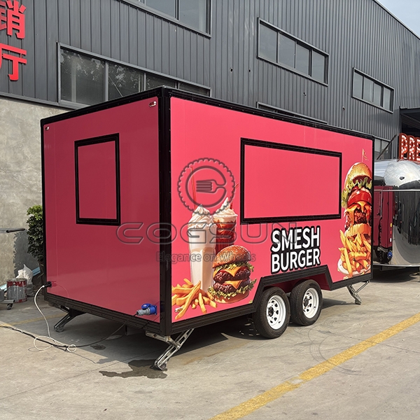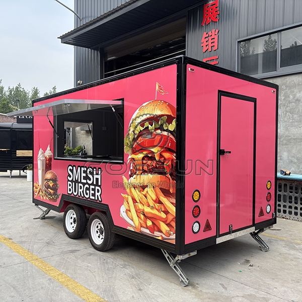 The 13ft pink sticker square food trailer is a stylish, functional mobile catering unit with a vibrant pink exterior and appetizing food-themed stickers, designed to attract crowds. Compact yet spacious, its square design maximizes space efficiency, while the single service window allows for quick customer interactions. Built on a sturdy chassis, it offers durability and reliable performance for various venues and events.
