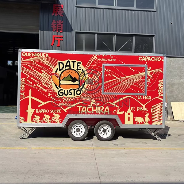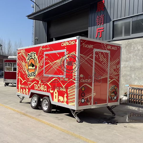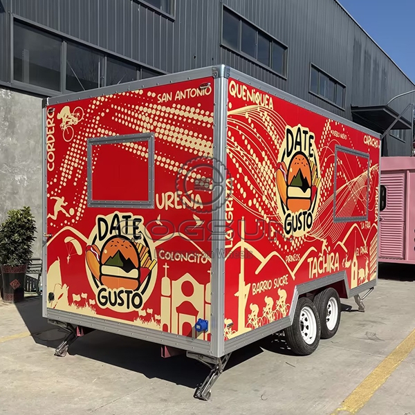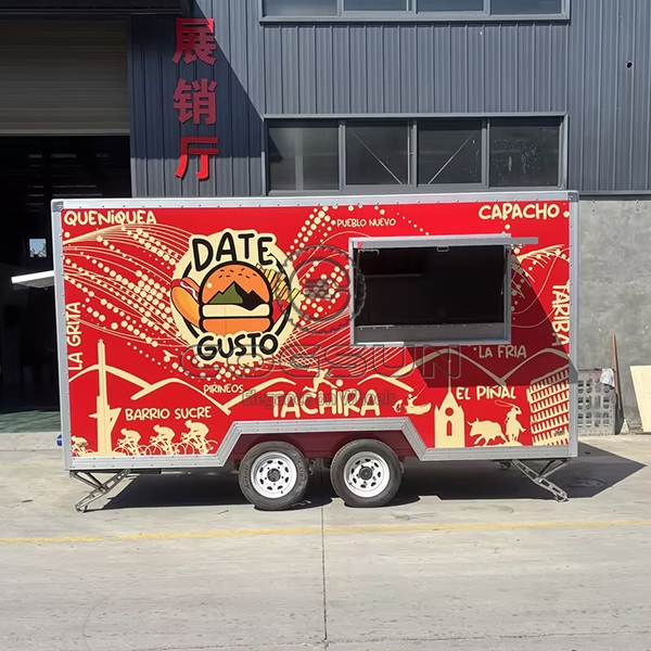 The 13ft red sticker square food trailer for hamburger sales is a vibrant, functional mobile catering unit that merges an eye-catching red sticker exterior with bold graphics to enhance visibility and brand presence, while its square design optimizes space for efficient food preparation and service, all within a compact, easily towable frame.