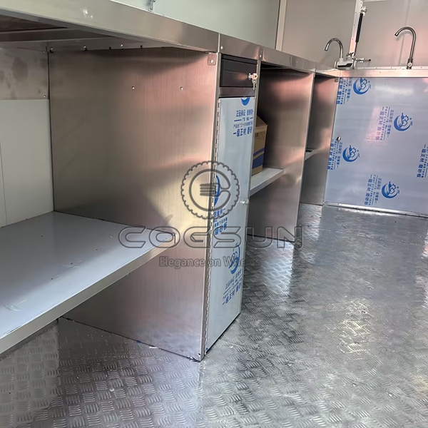 - Sink with Water Supply: Facilitates handwashing and cleaning of food preparation areas, ensuring compliance with health and safety standards.