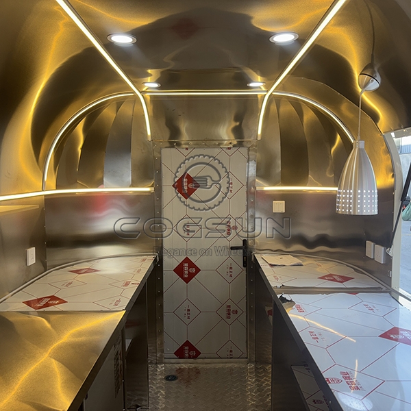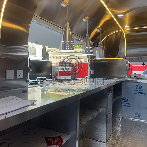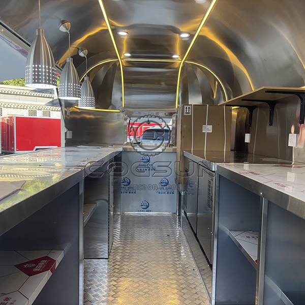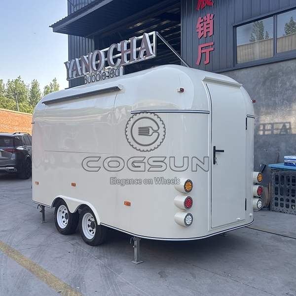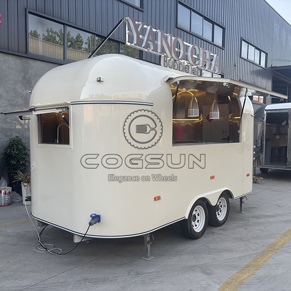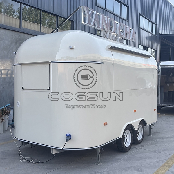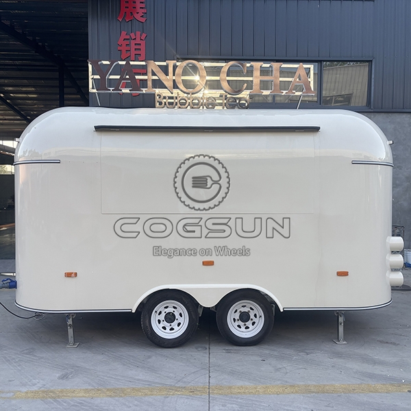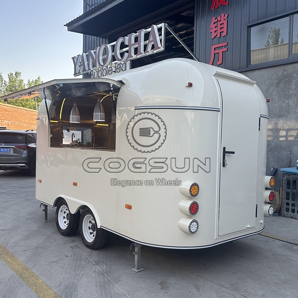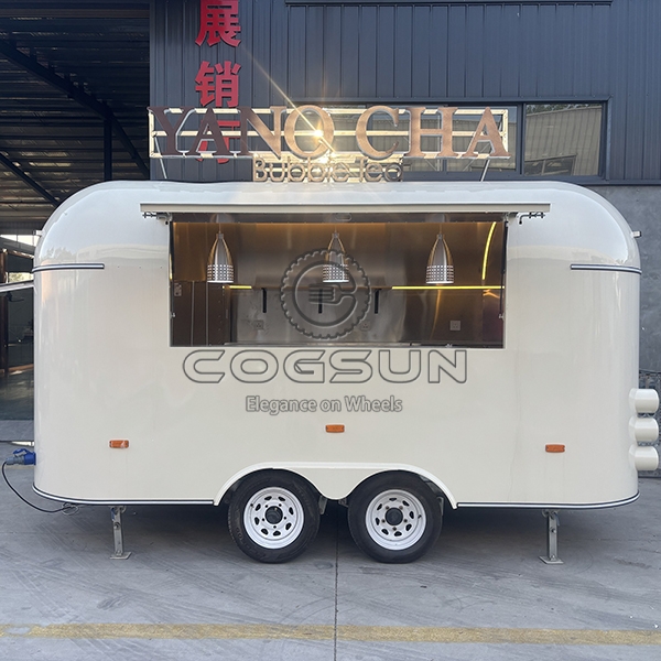 The 13ft white airstream food trailer with signage is a sleek and modern mobile food unit that combines classic airstream styling with contemporary functionality. Its polished white exterior and distinctive rounded shape make it an eye-catching addition to any location, while the integrated signage provides ample space for branding, ensuring your business stands out in crowded markets or events.