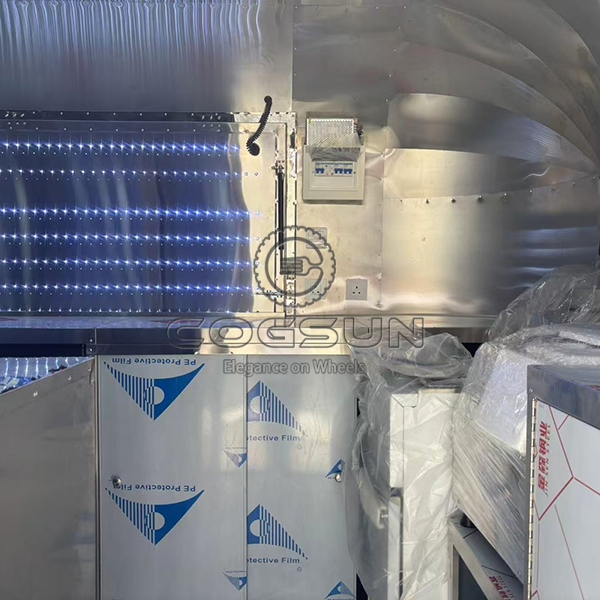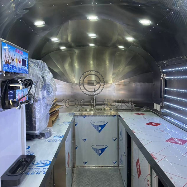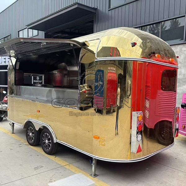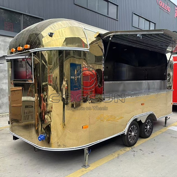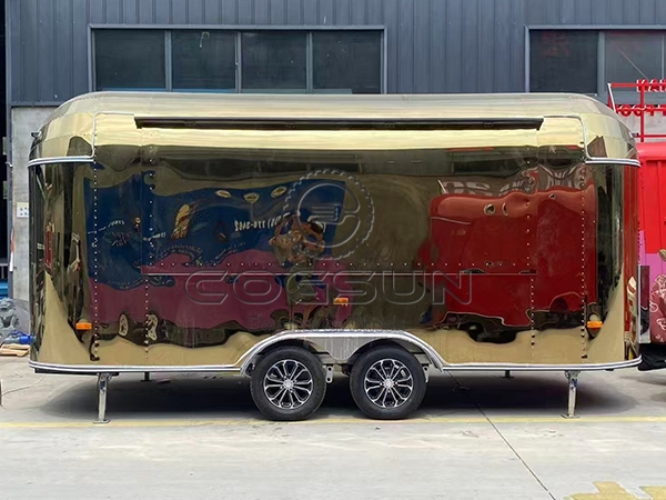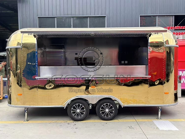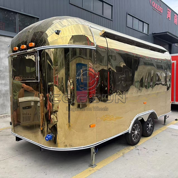 The 15.7ft gold airstream food trailer is a visually striking high-end mobile food truck. Its gleaming gold mirror finish not only exudes luxury and sophistication but also instantly makes it a focal point in any environment.