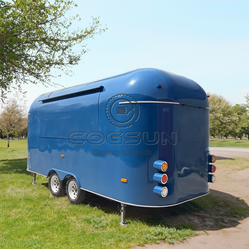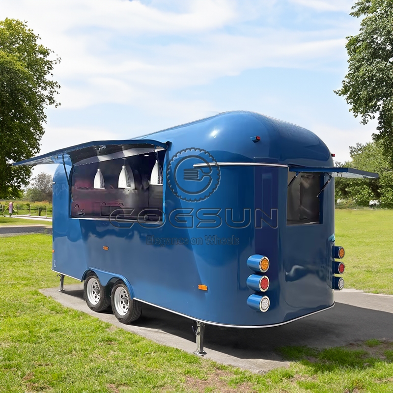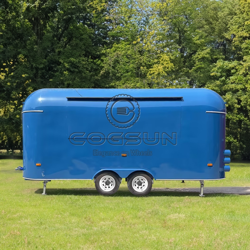 The 15ft blue airstream food trailer is a stylish and functional mobile food unit that combines a vintage aesthetic with modern conveniences. Perfect for food entrepreneurs looking to make a statement, this trailer offers a unique blend of durability, mobility, and charm.