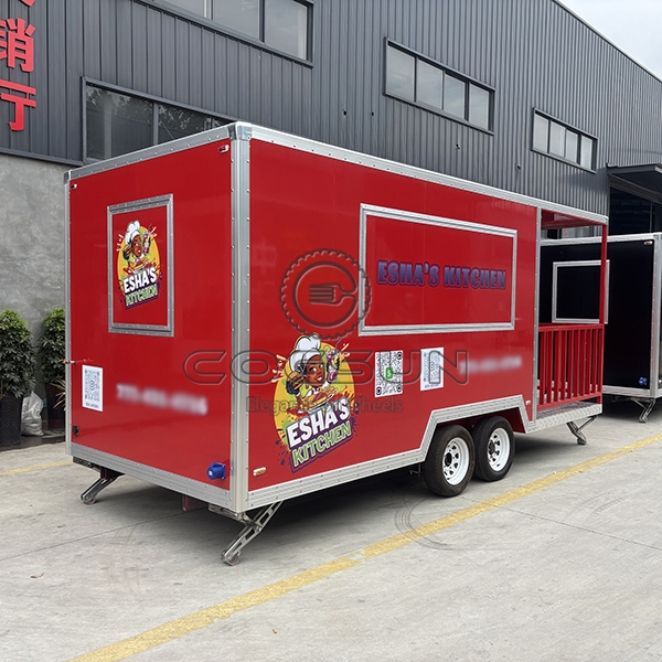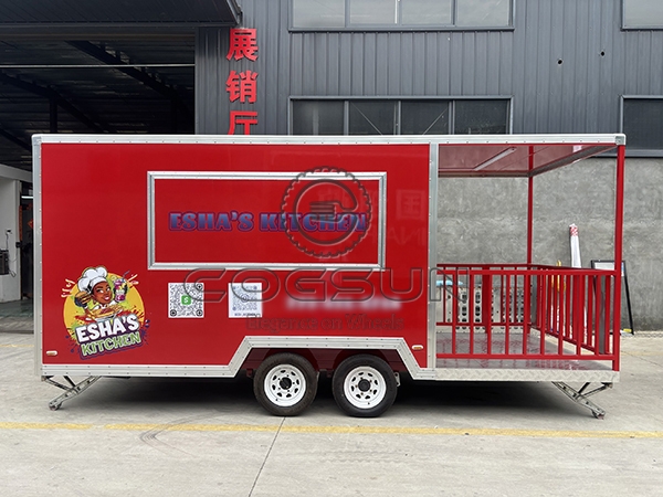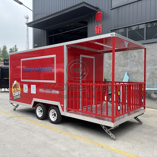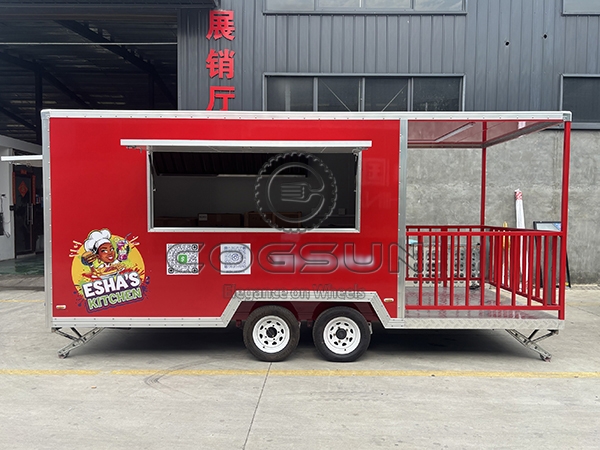 The 15ft sticker red square food trailer with fence is a versatile, durable, and highly visible mobile food service unit, designed to help food vendors stand out in a variety of settings. With its vibrant red finish and eye-catching stickers, this trailer is built to attract customers in busy environments, while the included surrounding fence enhances safety and provides an extended serving area, making it a practical and efficient choice for diverse venues and events.