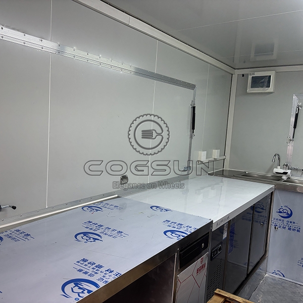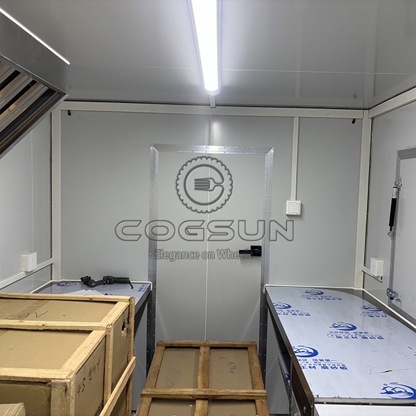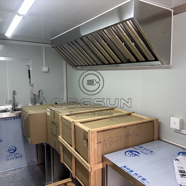 - Range Hood: A large stainless steel range hood ensures proper ventilation, maintaining air quality inside the trailer.
