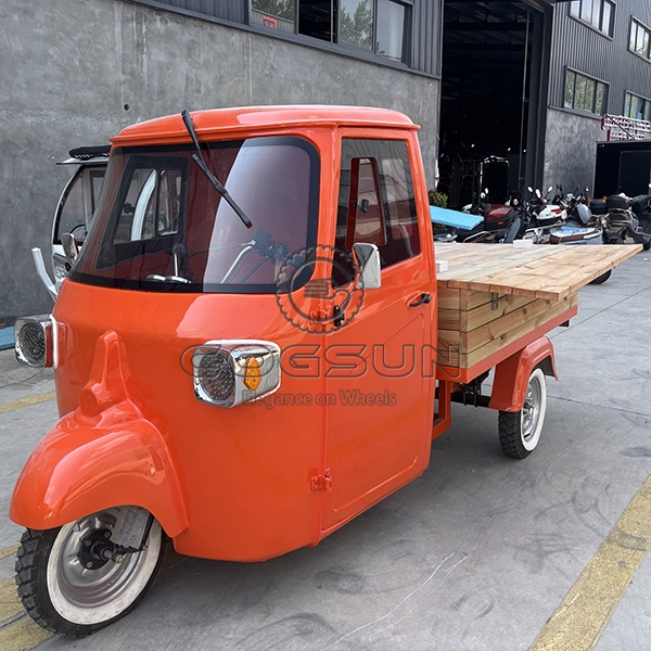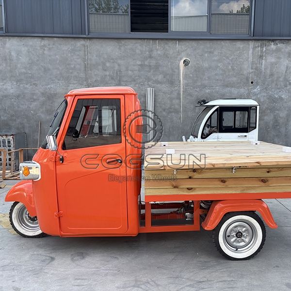 The orange piaggio ape food truck features the unmistakable, compact silhouette of the classic Ape, updated with a bright orange finish that ensures high visibility and a cheerful appeal. Its small footprint allows for easy navigation through narrow city streets and tight event spaces, while the open wooden cargo bed at the rear provides ample room for customization, display, or serving. The enclosed cab offers a comfortable space for the operator, with large windows for clear visibility and customer interaction.